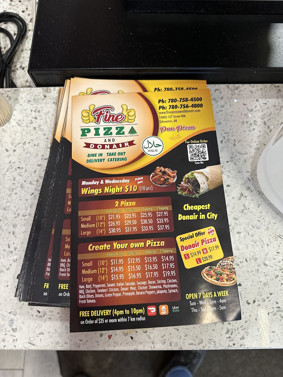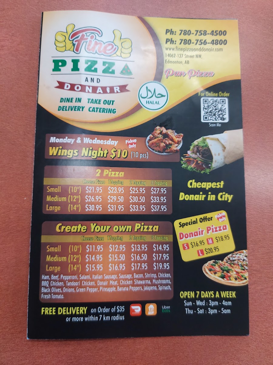 Welcome to Fine Pizza And Donair, a hidden gem located at 14062 127 St, Edmonton, AB. Renowned for its delicious blends of flavors, this establishment offers a menu that exceeds typical pizza expectations. Their standout dish, the Halal Donair Pizza, features tender donair meat, fresh veggies, and gooey cheese, all atop a perfectly crisp crust—an option highly praised by customers.
